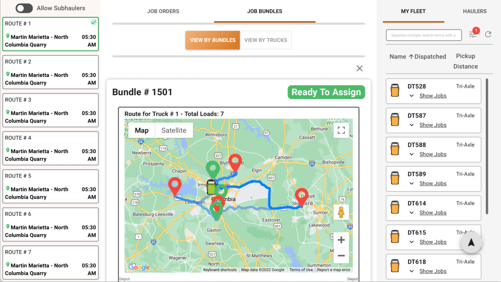 This is much more of a daunting art than science. A Dispatcher has to consider many variables with every order: Truck location(s) and status, order size,driver performance histories and hours worked… and this list is not exhaustive.